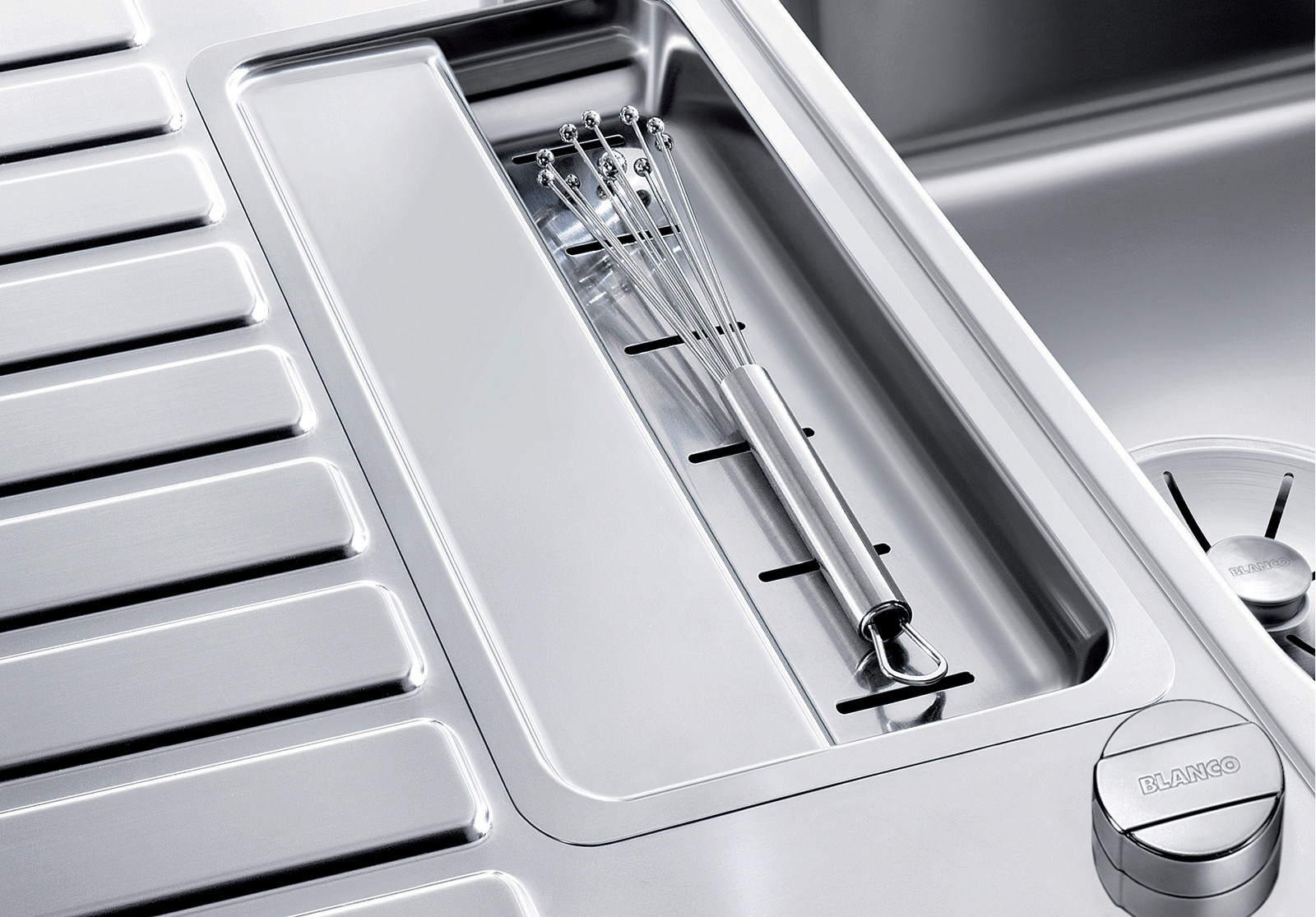 - Перфорированная вставка в дополнительную чашу из нержавеющей стали, отводная арматура с клапаном-автоматом 3 1/2'' для основной чаши.